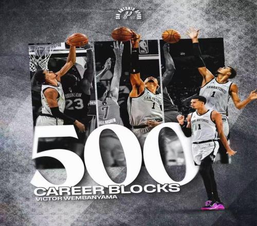 文班亚马达成生涯500个盖帽里程碑,创造历史第二年轻500盖帽纪录,且只用143场达成500盖帽创造历史第4快纪录。