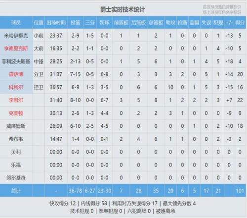 爵士三分也不准,上半场只有14中2,但是三分出手数比快船少了10次。内线得分爵士36-16完爆快船,半场战罢,快船53-50只领先3分。爵士9人休战,快船第二节输了11分……李凯尔8中7,半场砍下16分8篮板,正负值+18!